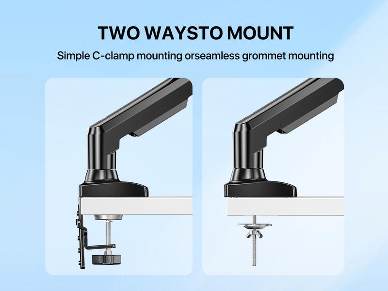 The C-clamp or grommet mounting base will save more than 80% desktop space compared to a vertical monitor stand with a heavy-duty base.